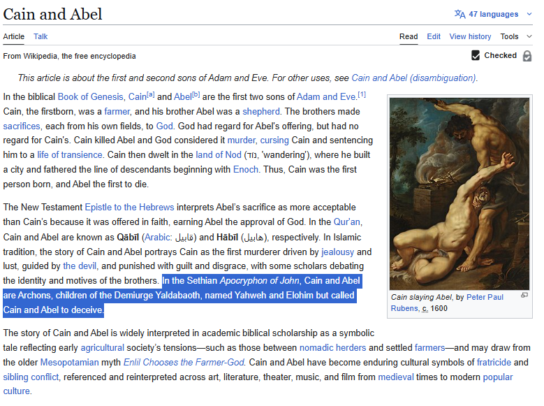 Wikipedia slipped the Gnostic Gospels into the Biblical explanation of Cain & Abel!!!