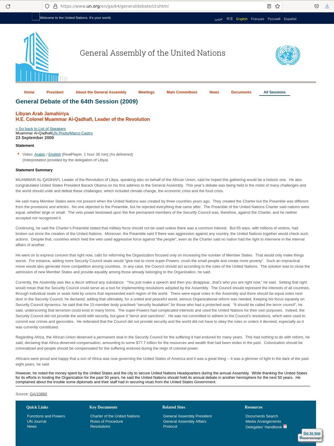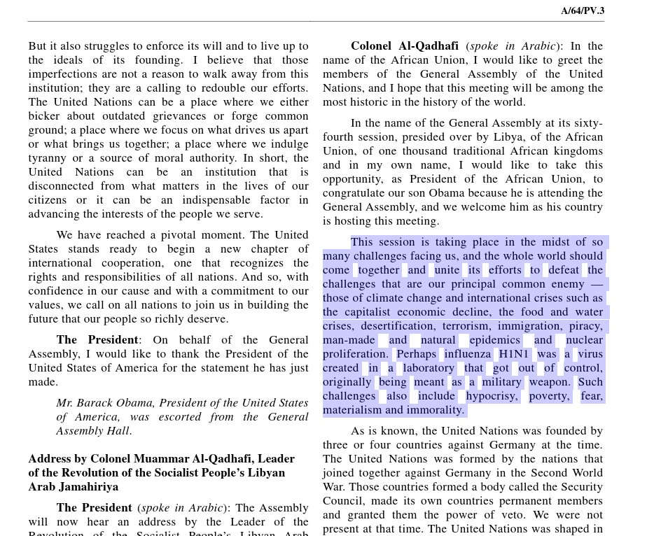 This transcript was actually a pain to find because the UN moved & 404’d (scrubbed) many of their Ghaddafi records. but their indexing algorithm was easy to reverse-engineer. But it seems as though they dont want you to easily find it. We eventually found it here: https://documents-dds-ny.un.org/doc/UNDOC/GEN/N09/521/79/PDF/N0952179.pdf?OpenElement