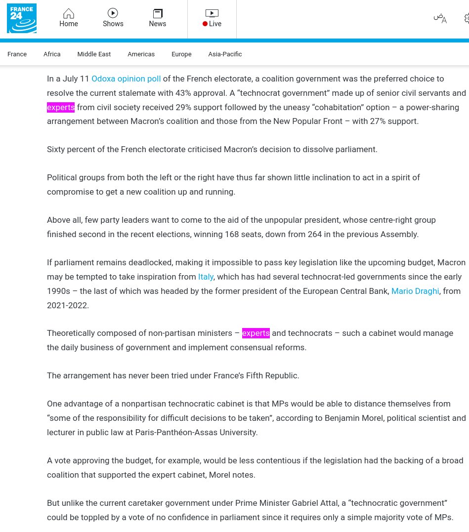 As recent as 2024, the mask REALLY slipped when the ruling class of France (known for a history full of scary revolutionary ideas) was floating the idea of temporarily implementing a “Technocratic Government” as means to bypass deadlocks in their Parliament. It was clearly a trial balloon and (fortunately) there was massive public outcry. However this event served as another confirmation that there is clearly a Worldwide Oligarchical push for this form of governance. It seems to be constantly simmering behind closed doors.