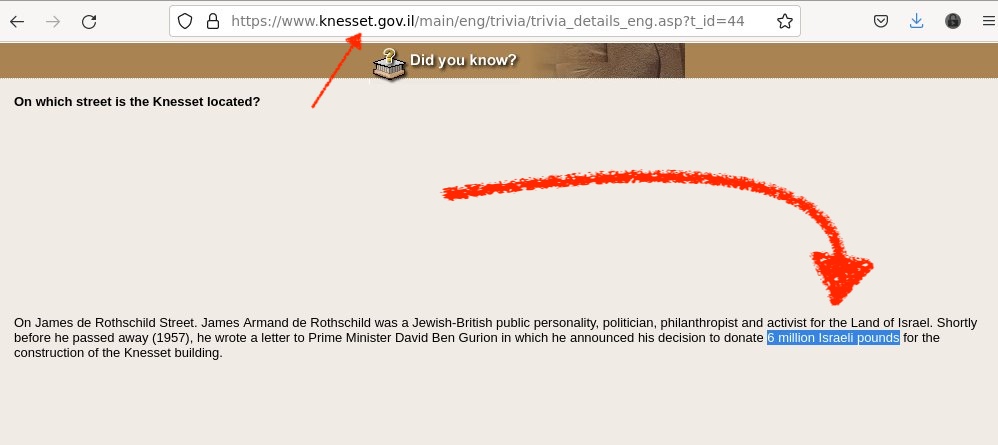 Why then, do we keep getting told that historical significance of “the Rothschilds” is an antisemitic conspiracy theory? Paying to build Israel’s parliamentary building seems HUGELY relevant.