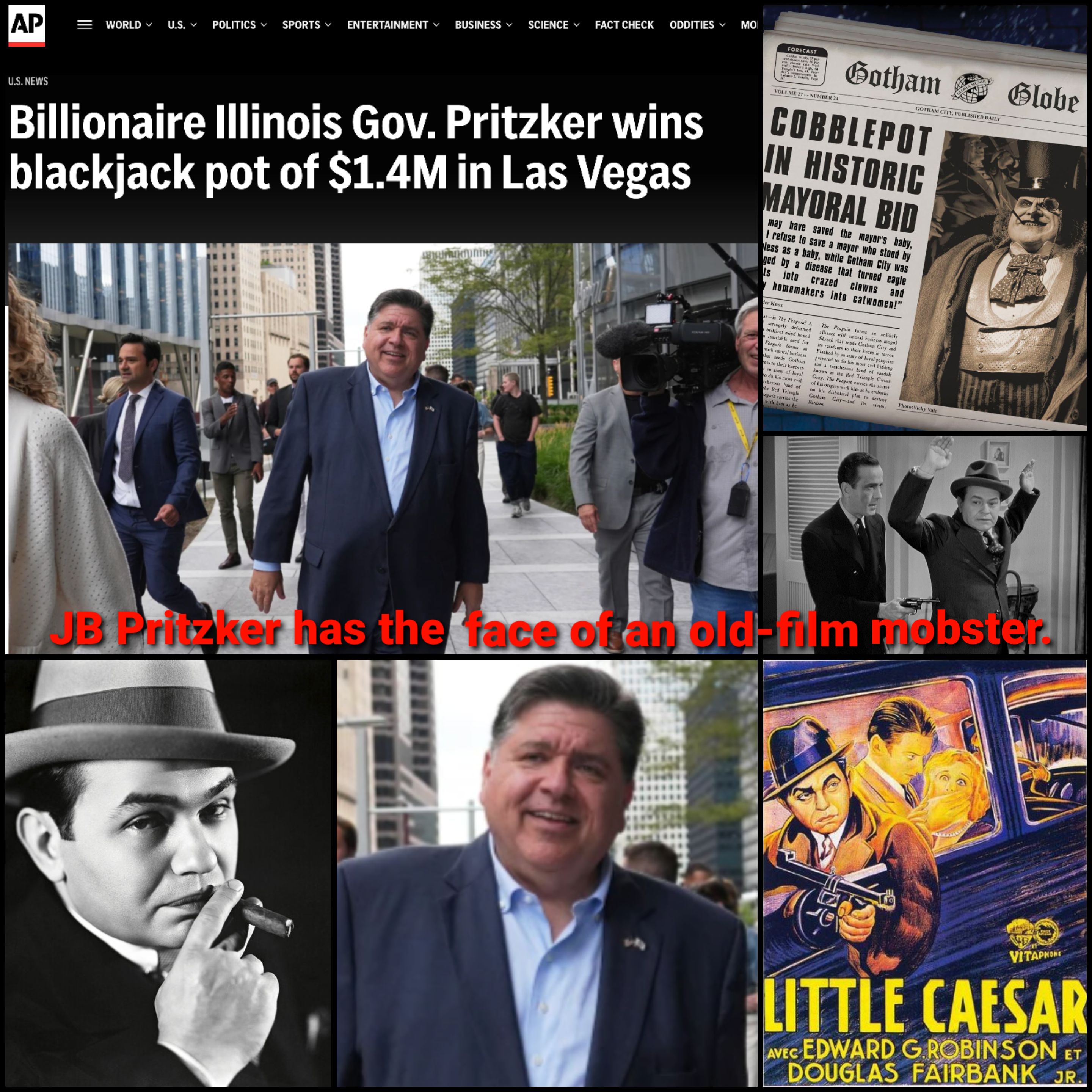 JB Pritzker has the face from one of those old Black & White crime thrillers…the mobster-turned-politician… with a persona to match. He’s like an old Batman villain. With a tommy-gun and fedora…Edward G Robinson type