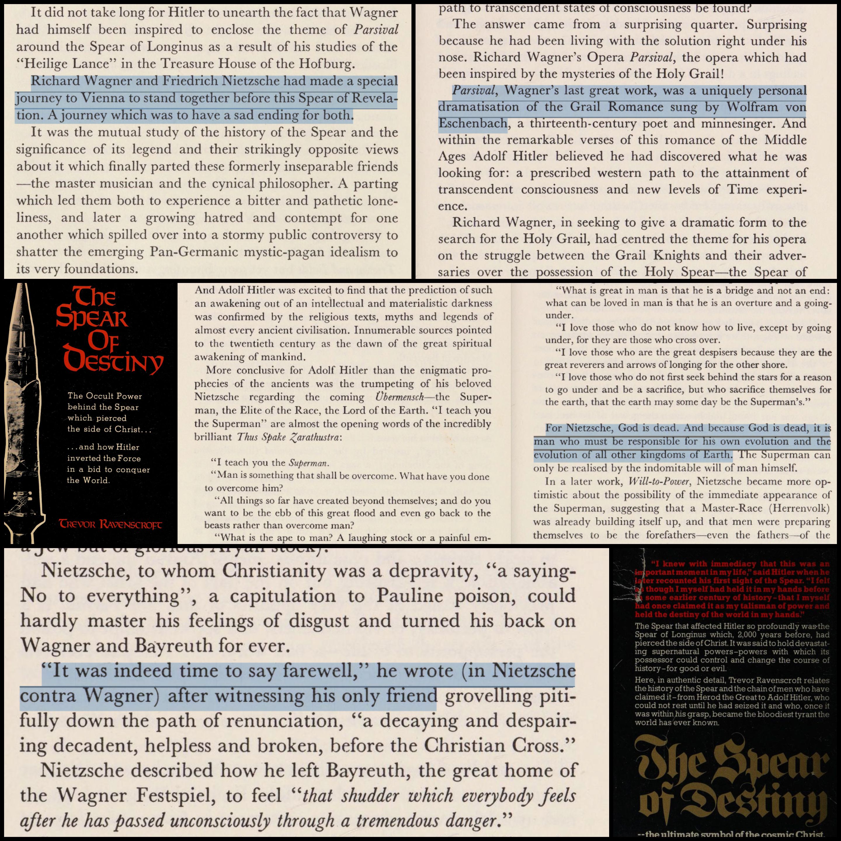The composer Wagner (pronounced “Vahg-ner” on NPR classical stations lol) was close friends with Nietzsche and they shared an obsession with the Occult and Teutonic mythology (specifically “Parzival”).