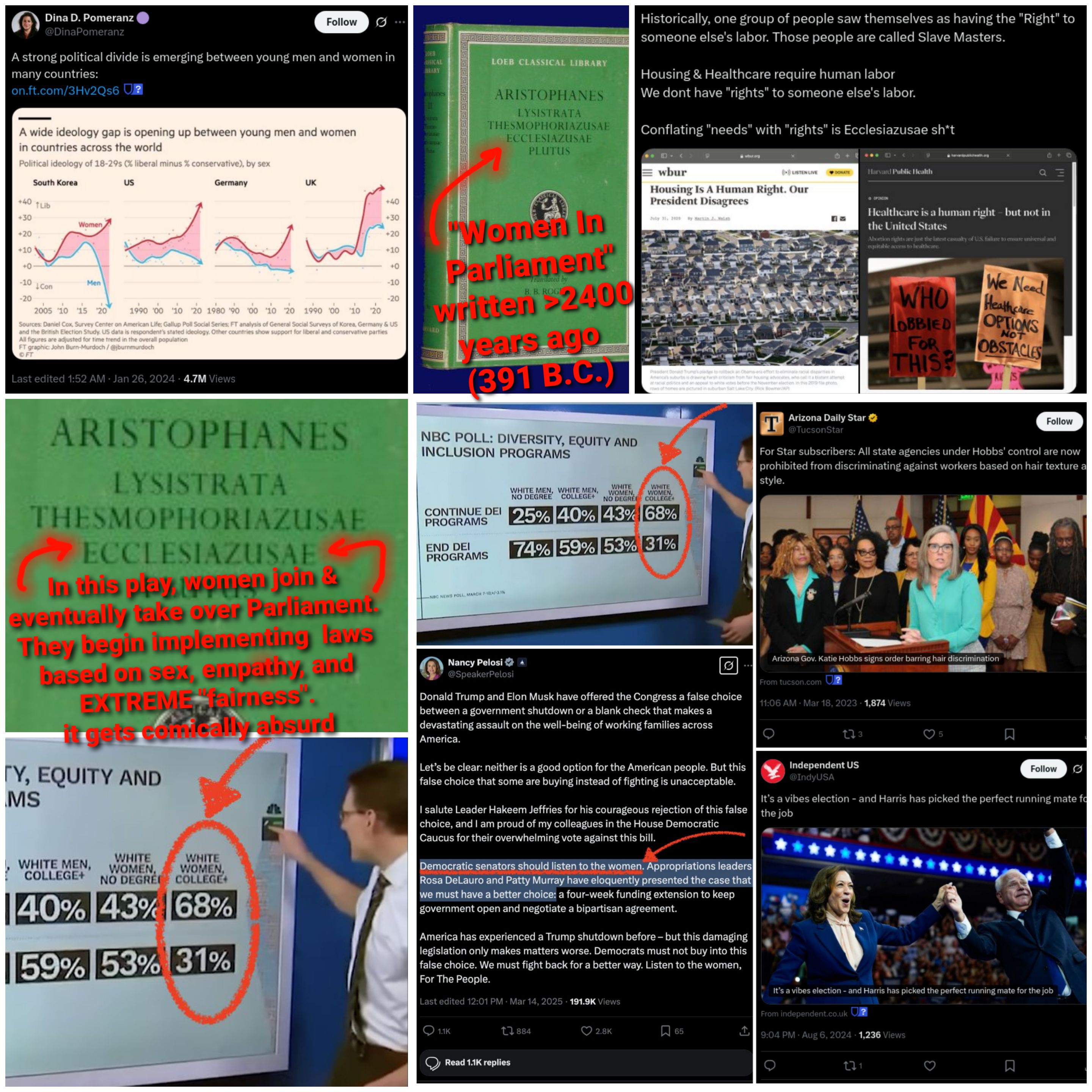 P.S. Aristophanes didnt have the word ‘communism’ when he wrote it 2400 years ago, but it is certainly the system of government he is describing. Maybe “communism” itself is inherently feminine. It seems that “Darwinian selection” would actually ‘select’ for females to lean towards “commune”. Tribes w/ females who had STRONGER communal-ethos would’ve had more survival advantages (e.g. wet-nursing, nannying, food gathering, etc).